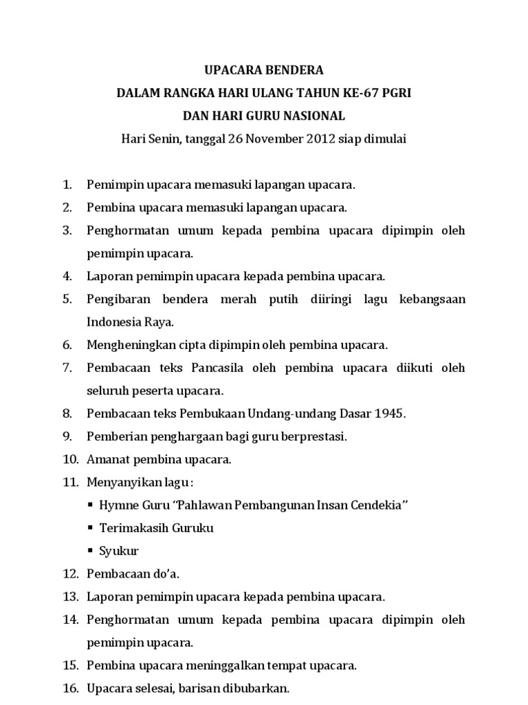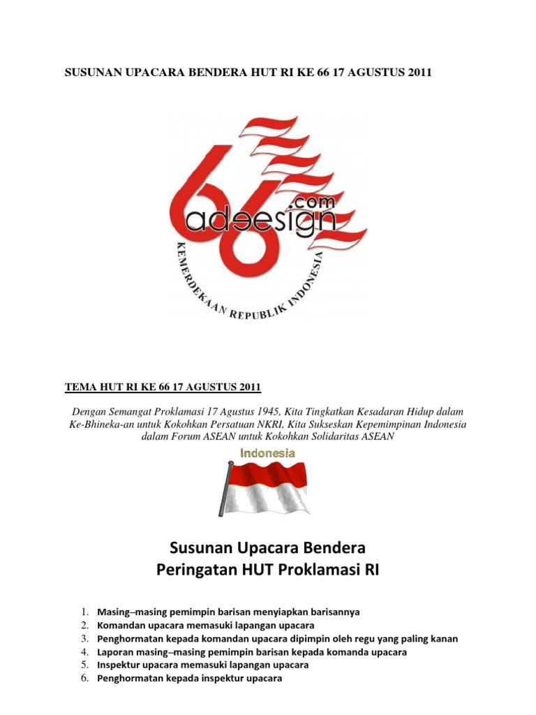 Tidak hanya dikalangan anak sekolah ataupun pegawai negri saja tetapi dilingkungan masyarakat juga ada beberapa rt yang melakukan upacara bendera. Memperingati hut ri yang ke 74 pada tanggal 17 agustus 2019 dengan cara melakukan apel pagi atau upacara bendera. Contoh susunan acara upacara 17 agustus layartekno setiap daerah di indonesia tanggal 17 agustus pasti melakukan upacara bendera 17 agustus. Menjelang diperingatinya hari ulang tahun hut kemerdekaan republik indonesia yang bertepatan pada hari sabtu 17 agustus 2019 kami akan membagikan file contoh naskah doa upacara bendera untuk peringatan hut ri. Susunan upacara bendera peringatan hut proklamasi ri ke 63 minggu 17 agustus 2008 a. Upacara bendera memperingati hari ulang tahun kemerdekaan ke.