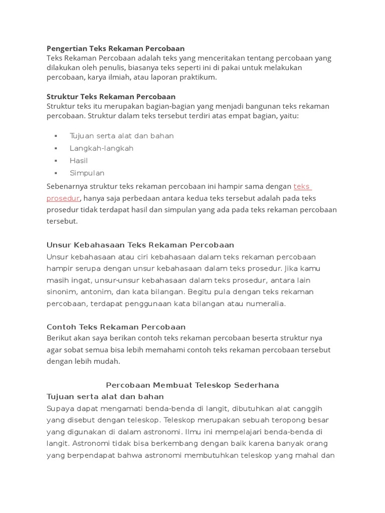 Contoh teks rekaman percobaan tentang makanan. Teks rekaman percobaan pengertian unsur ciri fungsi contoh untuk pembahasan kali ini kami akan mengulas mengenai teks rekaman yang dimana dalam hal ini meliputi pengertian struktur unsur dan contoh untuk lebih memahami dan mengerti simak ulasannya berikut ini. Pada kesempatan yang lalu kita telah mengulas secara singkat tentang teks laporan percobaan. Kali saya akan memberikan kepada sobat semua 4 contoh teks rekaman percobaan yang saya harap dengan diberikannya contoh teks rekaman percobaan ini bisa membantu menyelesaikan tugas bahasa indonesia sobat semua atau bisa juga hanya dijadikan referensi agar sobat dapat lebih memahami lebih dalam teks rekaman percobaan. Pelajaran hari ini untuk melanjutkan materi sebelumnya mengenai pengertian struktur ciri teks rekaman percobaan. Tujuan alat dan bahan. Teks rekaman percobaan pengertian unsur ciri fungsi contoh untuk pembahasan kali ini kami akan mengulas mengenai teks rekaman yang dimana dalam hal ini meliputi pengertian struktur.
