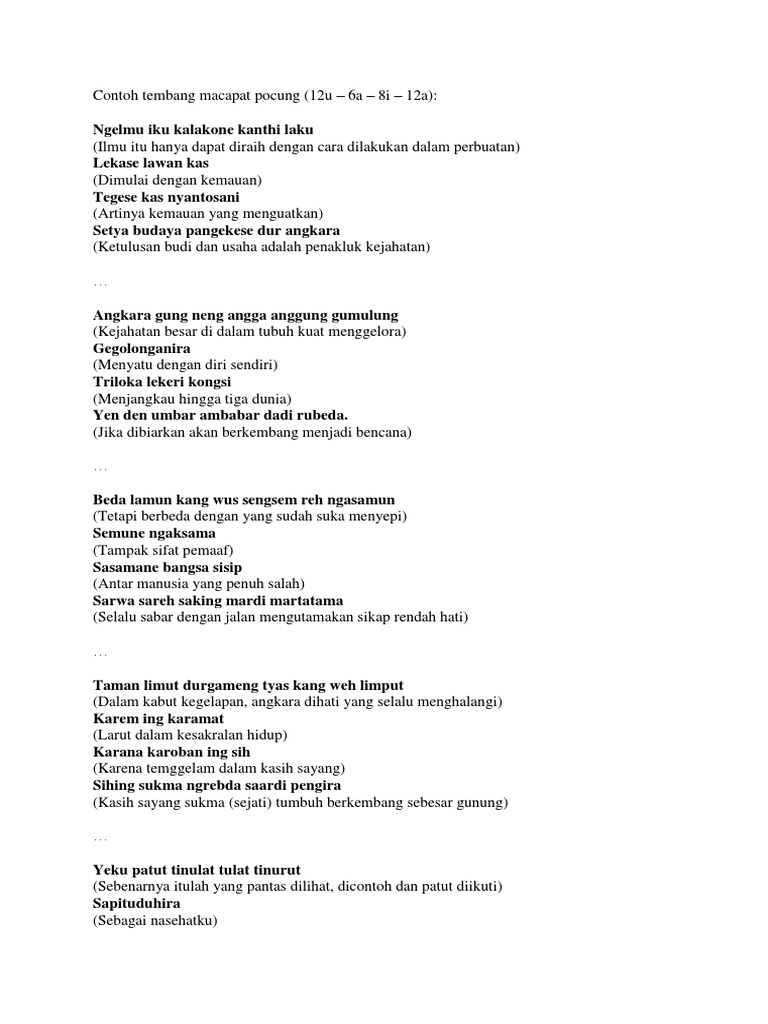 Tembang kinanthi berisikan bimbingan atau tuntunan yang dilakukan oleh orang dewasa kepada anak anak. Contoh tembang pocung 12u 6a 8i 12a ngelmu iku kelakone kanthi laku lekase lawan kas tegese kas nyantosani setya budya pengekesing dur angkara berikut penjelasan mengenai aturan guru gatra guru lagu dan guru wilangan dari tembang pucung. Pucung merupakan salah satu dari 12 puisi jawa tembang macapat yang paling sederhana.
