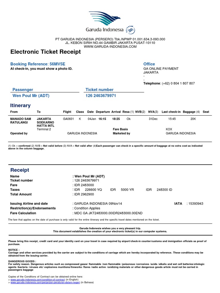 With more than 600 daily flights garuda indonesia proudly serves its passengers with the award winning garuda indonesia experience service which highlights the warm indonesian hospitality and rich diverse culture. Contoh e ticket garuda indonesia.