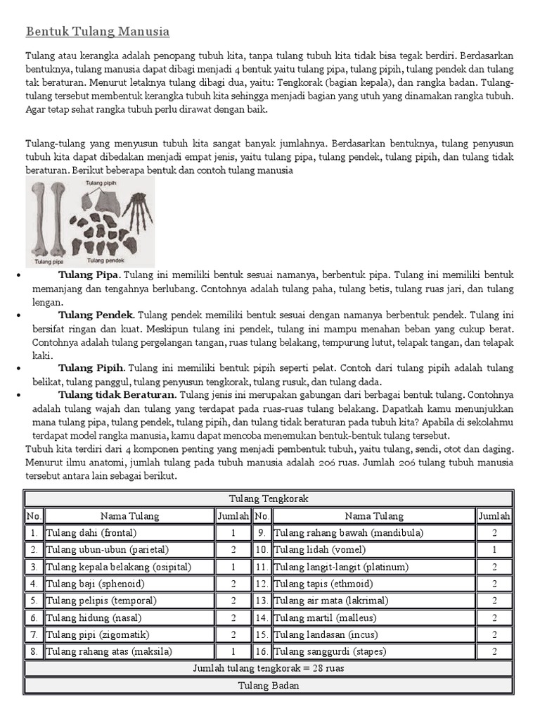Tulang tak beraturan pada manusia. Berdasarkan sifat fisik dan jaringan penyusunnya tulang manusia terbagi ke dalam 2 jenis yaitu tulang rawan dan tulang keras osteonadapun berdasarkan bentuknya tulang terbagi ke dalam 4 jenis yaitu tulang pipa tulang pipih tulang pendek dan tulang tak berbentuk. Contoh tulang pipih yaitu tulang rusuk tulang belikat dan tulang tengkorak. Tulang pipih berfungsi sebagai penyusun dinding rongga atau sebagai pelindung. Contoh tulang pendek yaitu tulang pergelangan dan telapak tangan dan kaki. Jaringan ikat padat ini terdapat pada tempat tempat yang mengalami tegangan atau kontraksi dari segala arah sehingga serat seratnya akan berupa berkas teranyam yang arahnya tidak tentu.