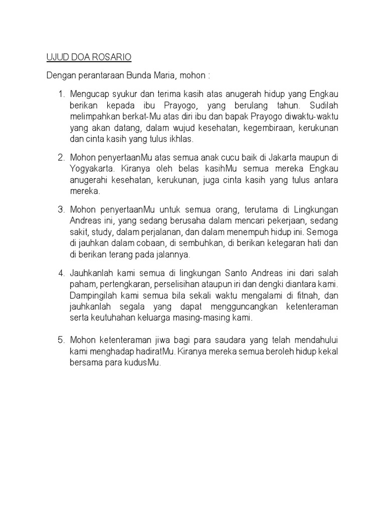 Bapa ajarilah kami selalu mengikuti kehendak mu. Cara memimpin doa rosario. Berikut ini adalah tata cara berdoa doa rosario lengkap dengan bacaan setiap peristiwa dan renungan. Simak contoh berikut supardi 5092019 doa rosario merupakan salah satu tradisi doa yang telah lama ada dalam gereja katolik. Ya bapa ku jikalau engkau berkenan ambilah cawan ini dari hadapan ku tetapi janganlah menurut kehendak ku melainkan kehendak mu yang terjadi mat 2639. Ini hanyalah contoh ujud atau permohonan dalam doa rosario sesuaikan dengan kata kata anda sendiri.