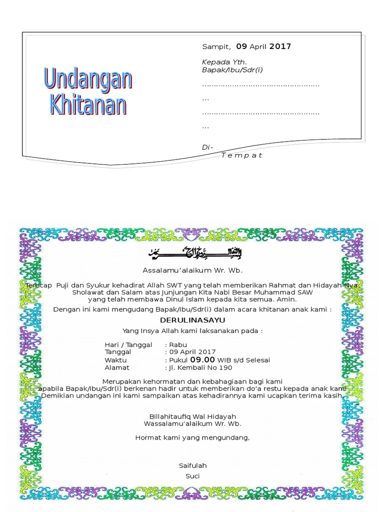 Baik acara besar ataupun syukuran sederhana. Surat undangan dapat berupa surat resmi maupun tidak resmi. 7 7 mendukung tandai dokumen ini sebagai bermanfaat 0 0 menolak tandai dokumen ini sebagai tidak bermanfaat tanamkan. Contoh undangan khitanan ms word pada postingan ini admin akan membahas beberapa contoh undangan khitan atau walimatul khitan yang mungkin bisa di jadikan referensi untuk membuat undangan. Jenggawur 4 februari 2015 walimatul khitan kepada yth. Contoh undangan khitanan yang bisa di edit bertemu lagi yah kali ini admin akan membagikan beberapa contoh udangan khitanan yang bisa di edit oleh semua kalangan.