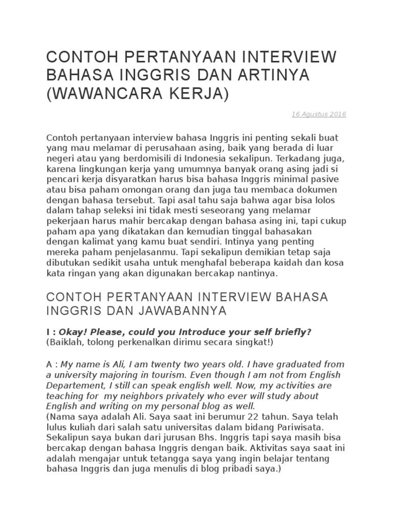 Jika anda mendapatkan panggilan interview yang mewajibkan anda memiliki kemampuan berbahasa inggris aktif anda harus bangga karena mungkin itu adalah perusahaan multinasional. 15 pertanyaan interview bahasa inggris plus arti dan contoh jawabannya saat wawancara kerja dengan bahasa inggris pertanyaan interview bahasa inggris pasti akan menjadi momok utama terutama kalau kamu tidak begitu mahir berbahasa inggris. Sebelum memulai alangkah baiknya jika anda mengucapkan salam tersenyum. Sobat pembaca pada posting kali ini saya akan share contoh percakapan interview wawancara kerja dalam bahasa inggrisinterview atau wawancara kerja dalam bahasa inggris biasa didapat jika perusahaan memberi persyaratan pelamar harus bisa berbahasa inggris atau pelamar sendiri yang menerangkan bahwa ia menguasai bahasa bahasa inggris. Itu adalah 21 contoh pertanyaan wawancara kerja dalam bahasa inggris selanjutnya sebisa mungkin jawab pertanyaan pertanyaan tersebut dengan jawaban jawaban yang sopan. Walaupun mudah memperkenalkan diri dalam bahasa inggris juga bisa dibilang susah.