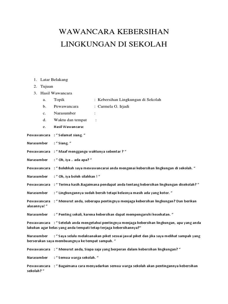 Wawancara tentang lingkungan lingkungan merupakan suatu hal yang sangat lumrah kita dengar bahkan setiap hari kita selalu berinteraksi dengan yang namanya lingkunganlingkungan dapat berupa sosial budaya rumah tangga dan lain sebagainya. Contoh laporan hasil wawancara laporan hasil wawancara adalah sebuah teks tertulis yang melaporkan suatu wawancara yang telah dilakukan baik itu wawancara dengan pedagang pengusaha guru ketua rt. Entah itu narasumber. Pada contoh wawancara pastinya setiap teks tersebut memuat berbagai jenis wawancara yang sesuai terhadap tema yang dipilih.